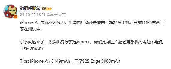 近日,有数码博主爆料称,国内TOP5手机厂商中将有两到三家跟进超轻薄手机,但博主并未明确指出是哪几家。此外,该博主还暗示这些新机的厚度大约为6mm。此前,vivo产品副总裁黄韬表示,公司曾深入探讨并制作了超薄类Air产品的手板,甚至纠结过将其归入X系列还是S系列,但最终选择放弃该项目。vivo认为,此类超薄形态难以保证用户的完整体验,尤其是影像功能会受到严重限制。这意味着,vivo不在博主曝光的手机厂商名单中。
