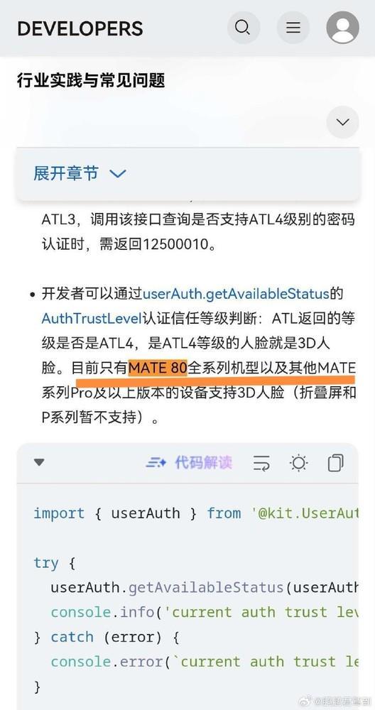 近日有数码博主爆料,在华为官方开发文档中发布了有关3D人脸的相关开发指引,暗示华为Mate80标准版也将支持3D人脸解锁。文档指出,目前只有Mate80全系列机型以及其他Mate系列Pro及以上版本的设备支持3D人脸(折叠屏和P系列暂不支持)。