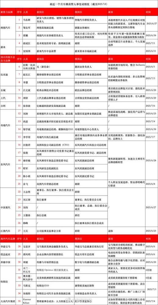 这些变动并非孤立事件,而是反映了2025年下半年汽车行业竞争态势的加剧。随着新能源汽车市场的迅速扩张和技术革新步伐的加快,各大车企都在寻求通过重组管理层来增强竞争力,提升市场响应速度,并加速产品创新和技术突破。