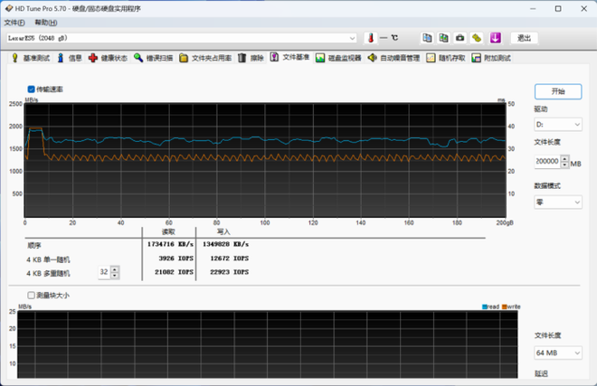 使用HD Tune软件测试雷克沙ES5磁吸移动固态硬盘的缓存与缓外情况,设置大小为200GB的写入与读取测试,可以看到写入曲线在前8GB内能够达到约2000MB/s的满速,随后降低并稳定在1300MB/s上下。蓝色读取曲线同样在前8GB处接近满速,随后略微下降,能够全程维持在1500-1800MB/s之间。这一性能表现无疑完全能够满足iPhone 10Gbps接口速率限制下的外录传输需求,在素材导出时也能提供相比常见10Gbps移动固态硬盘更高的效率。
