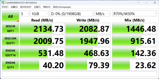 接下来使用CrystalDiskMark进行测试,雷克沙ES5磁吸移动固态硬盘测得顺序读写速度分别达到2134.73MB/s与2082.87MB/s,均超越了标称水平,性能表现优异。值得一提的是,ES5在移动存储设备相对不那么看重的混合负载与随机性能上也有超越同类产品的表现。