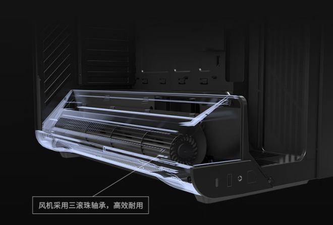 有DIY经验的玩家可能会感到疑惑:单纯侧进风方式是否会影响风道通畅性?机箱顶部受曲面玻璃影响,仅设计了80/90mm的风扇位宽度,是否难以选购到尺寸合适的机箱风扇,或者影响出风效率呢?这就不得不提iGame C25A VORTEX机箱的另一个核心卖点:布置在机箱底部,源于工业级设计的横流风机。