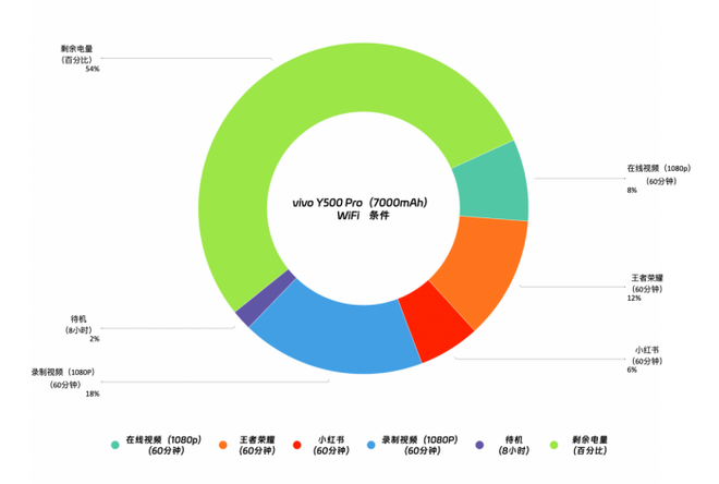 在电池方面,vivo Y500 Pro搭载了超薄蓝海电池,容量高达 7000 mAh。相比上一代 vivo Y300 Pro,在机身尺寸更小的前提下,电池容量依旧提升了 500 mAh,体现了极高的能效密度。该机采用领先的第三代硅负极材料与半固态电池技术,能量密度高达 837 Wh/L,不仅带来更强续航,也提供长达 5 年的超长寿命体验。配合全局直驱供电技术,能有效降低充电时手机的发热。在天极网的续航测试模型中,Y500 Pro的续航表现如下: