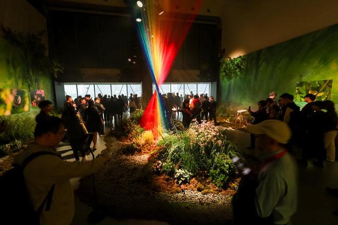 整个展览共设置三层展区。一层为影像艺术互动区,通过光影与影像的结合,为影像作品增添灵动和强烈的视觉呈现。二层是“文化遗产石窟”和“深海秘境”沉浸式观展体验区,“文化遗产石窟”的展区设计用纸艺重现了石窟场景,现场展示如唐代鎏金铁芯铜龙、商代戴金面罩青铜人头像等文物摄影作品,并通过投影的方式呈现,让参观者在虚实交错中完成一场跨越时空的文化对话;而在“深海秘境”体验区,借助光影技术,观众仿佛置身于神秘的海底世界,与水下生物进行一场亲密的对话。四层的展览内容则更加丰富,实景搭建的艺术风格花园美轮美奂,成为参观者争相打卡的梦幻背景;多面镜射的深空和沉浸式投影打造的极光海滩让人沉浸于“星穹咏叹”的视觉洗礼;更有那被大气中的尘埃粒子反散射形成的淡粉色光弧,这个反曙暮光也叫“维纳斯带",灰蓝的色带就是地球的影子。气膜材质灵感源于在观测时感受到的“天空的呼吸”,把无形的空气实体化。观众看到的不只是“固体”,也像空气在光中的显影。这标志了维纳斯带的生命性:轻盈、流动、随时间消散。球体仿佛在呼吸,回应着人类与大气之间最基本的连接,为到场的每一位观众献上一场真实可感的天文奇景。
