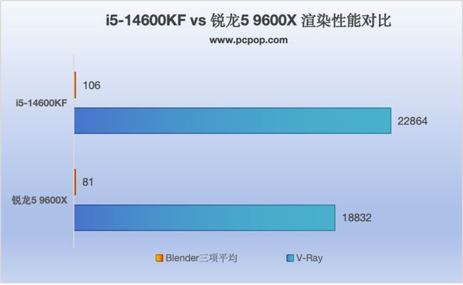而在 3D 渲染方面,我们测试了 V-Ray 以及 Blender 两款软件。凭借更多的核心和线程数。i5-14600KF表现更具优势,而锐龙5 9600X表现则是略逊一筹,受到了核心数量的制约。