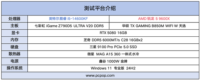 本次测试将测试包含基准,生产力和游戏在内的全面性能表现,用真实数据探究英特尔i5-14600KF和AMD锐龙5 9600X谁才是那个更加优秀,更全面的中端之选呢?测试平台方面,我们为双方搭配旗舰级的RTX 5080显卡,以确保不构成图形瓶颈,真实反映处理器性能差异,并搭配了相同的DDR5内存。具体平台详细配置请参阅上文列表。