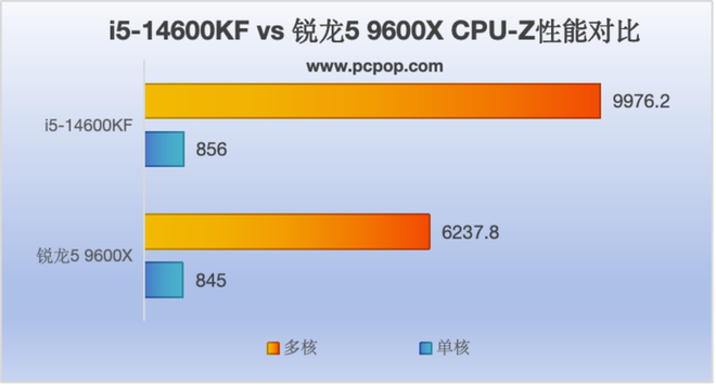 在 CPU-Z 的性能测试中,i5-14600KF单核得到856分,多核得到9976.2分,无论是单核成绩还是多核成绩对比锐龙 5 9600X都更加优秀。
