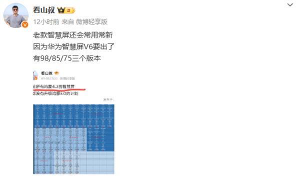 近日,有数码博主爆料称,华为即将推出新一代智慧屏V6系列,并提供98英寸、85英寸和75英寸三个版本。该博主还指出,华为老款智慧屏仍将延续“常用常新”理念,持续通过系统升级为用户带来新功能与新体验。
