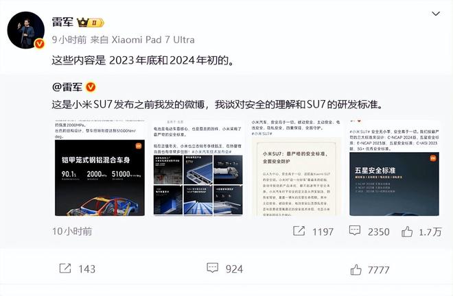 其实自从今年以来,小米汽车就持续面临舆论压力。小米SU7(参数丨图片)的碳纤维前舱盖功能争议、锁马力丑闻、购车尾款纠纷、高速事故等事件,都曾经饱受舆论攻击。雷军在接受媒体采访时也曾提及,小米汽车发布后成为全网被黑最惨的车企之一。