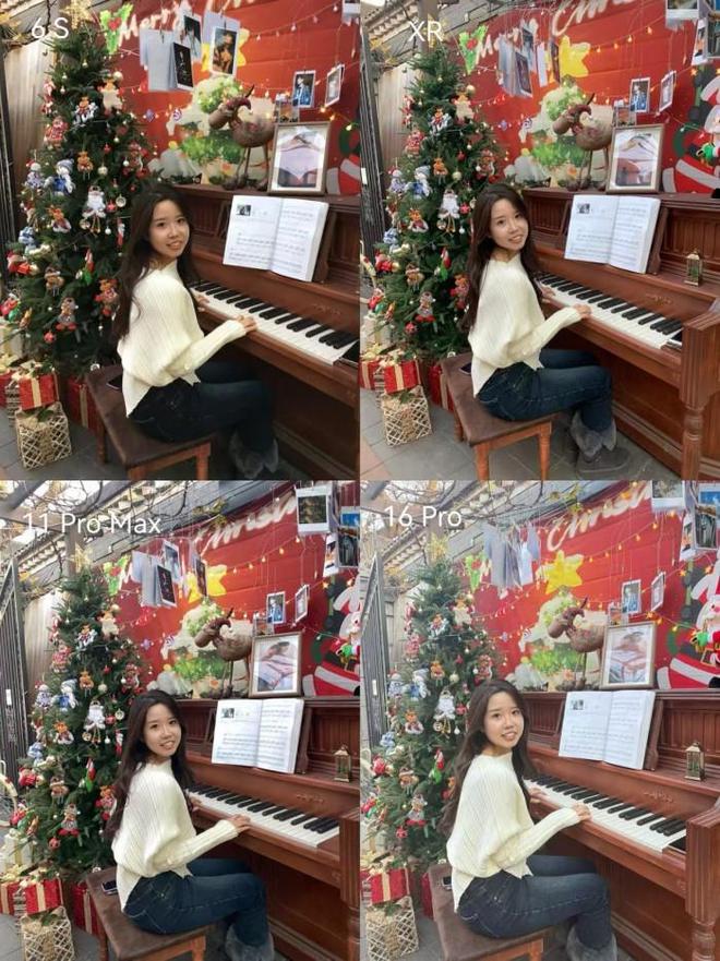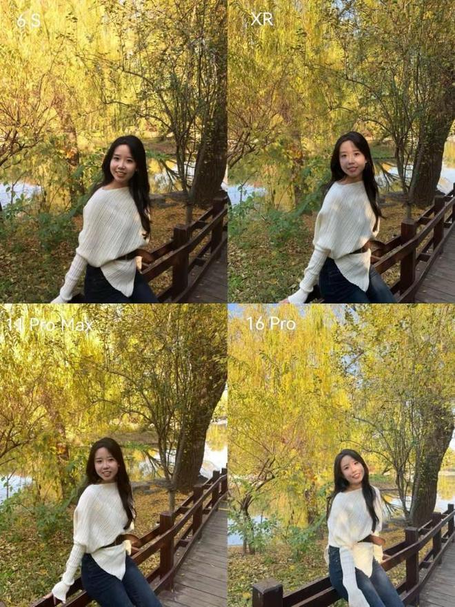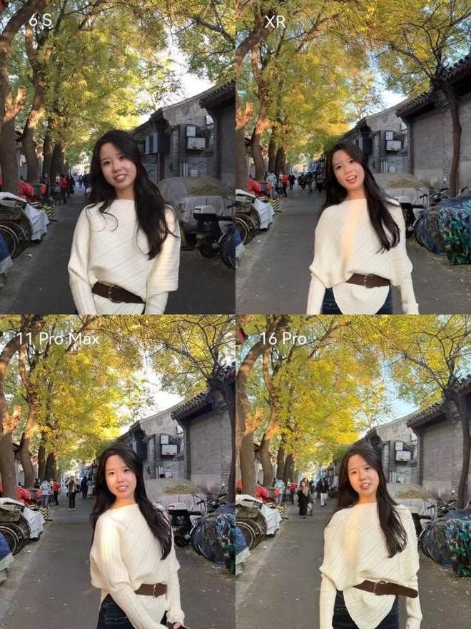 在第一组照片中,我们选取了胡同和公园作为拍照地点,模特面向太阳光,背景选取了大片黄色的秋叶。最近,北京的秋意正浓,不少喜欢拍照的女生专门挑好天气出门拍照,在胡同里也看到了不少妆容精致的女生拿着大大小小的各种设备互相记录,鲜活生动。从图中能够明显看出,6S虽然整体最暗,但却最有氛围感,有一种类似电影的色调,故事感满满。XR的表现也可以说是可圈可点,拍出来颜色偏粉,显得人皮肤质感通透且有气色。11 Pro Max和16 Pro毫无疑问在清晰度上完胜,但是为了清晰和明亮,过于追求环境光反倒是让皮肤看起来油且发黄,这对于喜欢拍照记录的人来说,实在是让人难以接受,此局可以说11 Pro Max和16 Pro完败。