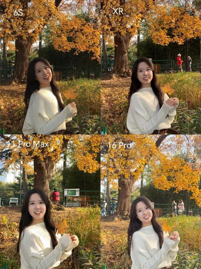 第二组我们选取了侧逆光角度,在以秋叶为背景的这组照片中,四款手机发挥都十分稳定,各有各的风格。追求氛围感和电影感选6S,追求自然选XR或11 Pro Max,追求皮肤白皙看起来像“自动美颜”选16 Pro,毕竟审美千人千面,怎么选择就见仁见智了。