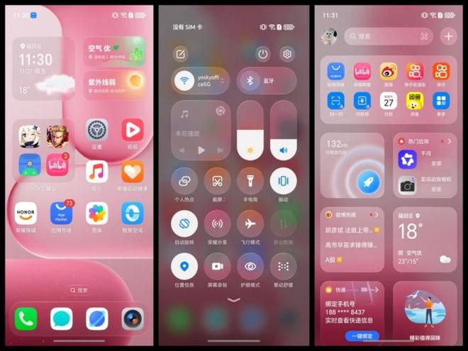 在系统方面,荣耀500系列配备全新的MagicOS 10.0操作系统。首先在视觉层面,桌面、通知栏和控制中心均进行了统一的焕新设计,采用高透玻璃质感的界面元素与悬浮式卡片布局,整体呈现更轻盈、通透、有呼吸感的视觉体验。图标也经过重新绘制,色彩更鲜活、造型更圆润,使系统观感更加现代统一。