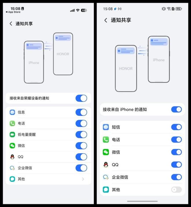在生态互联方面,荣耀500 Pro提供了跨品牌的全生态智联能力。手机不仅可以与苹果设备实现自由互联,还支持在荣耀与苹果手机之间同步消息通知,实现一机查看两台设备的信息。