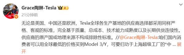 11月26日,特斯拉公司副总裁陶琳通过社交媒体表示:无论是美国、中国还是欧洲,特斯拉全球各生产基地的供应商选择都采用同样严格、客观的标准,完全基于质量、总成本、技术能力成熟度以及长期供货连续性,而且供应商的原产国或地理来源均不构成排除性标准。