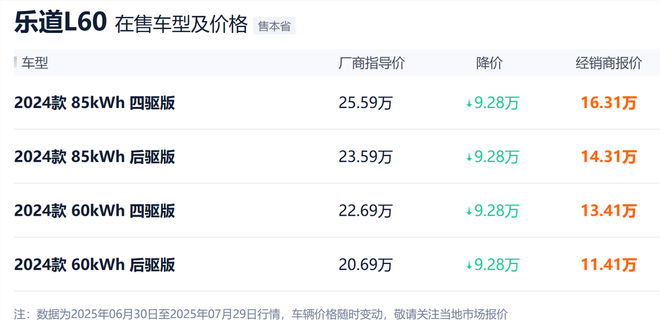而这还是在乐道L60大幅降价的基础上。此前乐道L60的销量一直表现平平,6月份乐道L60在全国多个地区都有大幅降价促销活动,入门版在叠加BaaS方案、贷款返现等政策后最低售价一度可以跌破12万元。并且还有免费换电、0首付等等权益。