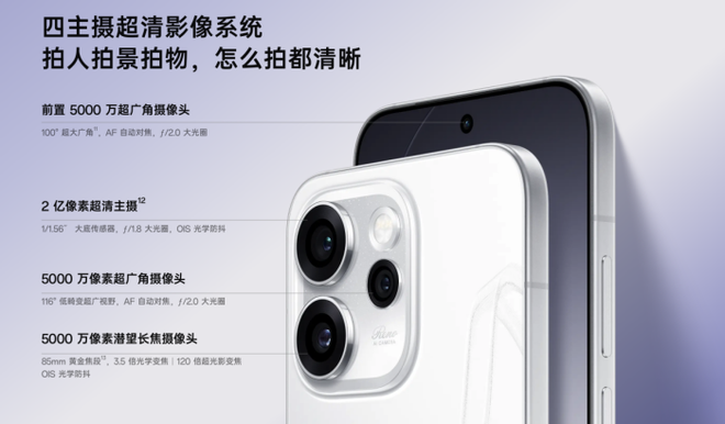 OPPO Reno15 Pro的影像系统硬件配置极其扎实:2亿像素主摄+5000万像素超广角镜头+5000万像素3.5倍潜望式长焦镜头,前置则为5000万像素自动对焦镜头。这套组合覆盖了日常拍摄的常用焦段,且无凑数镜头。