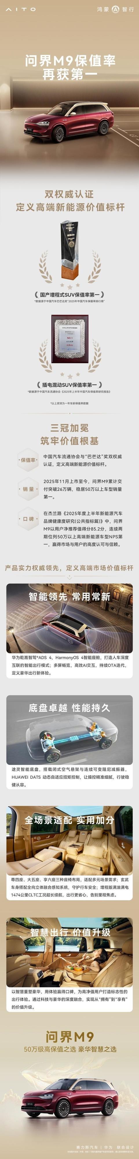 问界M9蝉联国产增程SUV保值冠军,交付量突破26万辆