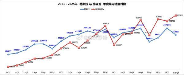 1月3日,汽车博主“痛快舒畅”发文称,自2023年第四季度起,比亚迪在纯电汽车销量领域便开始超越特斯拉,并且从2024年第四季度至2025年第四季度,已连续5个季度保持这一领先优势。
