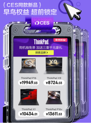 京东不仅是科技趋势的传播者,更是尖端3C数码产品抵达消费者的第一站。本届CES展出的多款重磅新品,包括多品牌最新AI笔记本、玄景M6模块化AR眼镜、XREAL 1S空间计算眼镜等前沿科技产品,都将在京东开启“全球首发”或“超前预约”,让中国消费者第一时间与世界同步体验最新科技成果。活动期间,用户还可参与1元购买重磅早鸟权益包,成功购买并登记后,可获得包含实用键盘鼠标、京东E卡及电脑双肩包等在内的超值好礼。其中,购买ThinkPad、雷神、机械师指定2026年新品,可享受专属早鸟权益:购买ThinkPad指定机型可参与抽免单大奖,并获赠LTE无线伴侣、Thinkplus 140W锋行者电源及五年无忧保;购买雷神、机械师指定新款电脑可享抽五折、抽2000元e卡特权,送鼠垫套装。