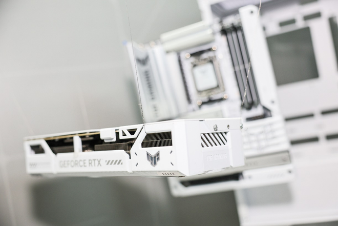 TUF GAMING BTF 2.5分解展示机采用TUF GAMING RTX5070 Ti BTF WHITE显卡以及TUF GAMING B850-BTF WIFI W主板。