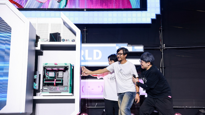 布会现场,华硕电脑开放平台中国区总经理俞元麟(普普通通Tony大叔)携手代言人RO姬、@凉风Kaze及主持人闫紫境GwAwa,共同开启【核心立方】,带来了全新的ROG×初音未来联名系列电竞装备,深度定制诚意满满,高能实力畅玩无忧!同时RO姬还与初音未来跨界合作的新歌。伴随音乐声响起,全场沸腾!
