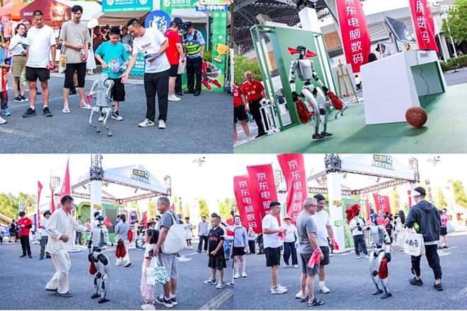 展区C位,无疑是此次京东3C数码为南通战队带来的“最强外援”——机器人和机器狗。宇树2024年推出的人形机器人G1具备超越常人的灵活性,能解锁无限运动潜力。它的表演搭档Go2机器狗是具身智能新物种,标配4D超广角激光雷达,感知系统提升200%。现场,机器人与观众热情互动,击掌、握手,与热情的观众同框拍照。机器狗则展示了自己握手、伸懒腰、倒立、双腿直立行走等花式超能力。为了给比赛球队助威,机器人还与机器狗Go2组队,用3D打印的足球现场表演花式射门。用“赛博足球”向赛场致敬,为这场长三角德比增添十足未来感。此次,京东3C数码携宇树科技机器人惊喜现身苏超,是竞技激情与科技魅力相互融合的一次跨界尝试,也是京东深耕智能机器人产业的注脚之一。