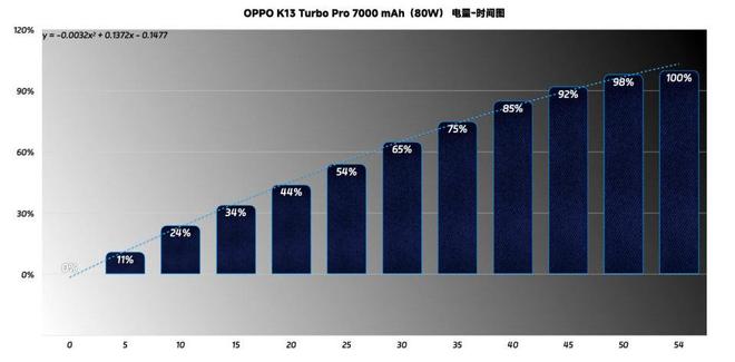 在充电方面,OPPO K13 Turbo Pro支持了最高80W有线充电,在天极网的实测中,半小时充电65%,充满共计耗时54分钟。