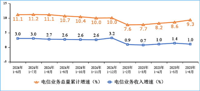 7月22日,工业和信息化部公布的《2025年上半年通信业经济运行情况》中指出,2025年上半年电信业务收入保持正增长,电信业务总量增长较快。其中电信业务收入累计完成9055亿元,同比增长1%。按照上年不变价计算的电信业务总量同比增长9.3%。