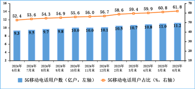 数据显示,截至6月底,5G基站总数达到455万个,三家基础电信企业及中国广电的移动电话用户总数达18.1亿户,比上年末净增1993万户。其中,5G移动电话用户达11.18亿户,比上年末净增1.04亿户,占移动电话用户的61.8%。