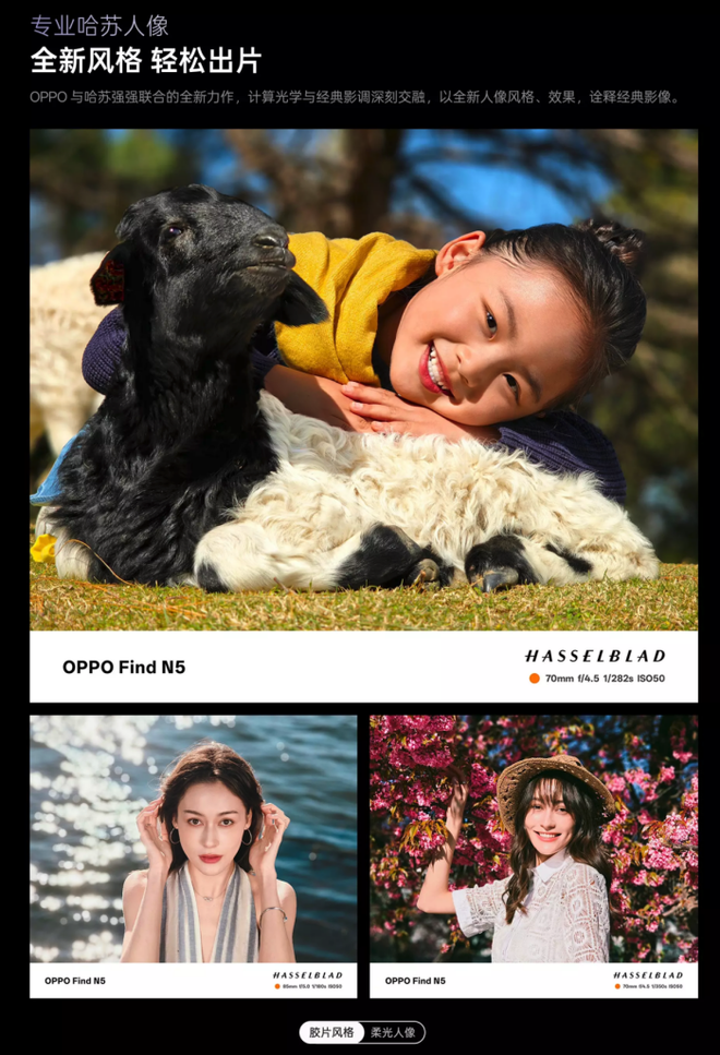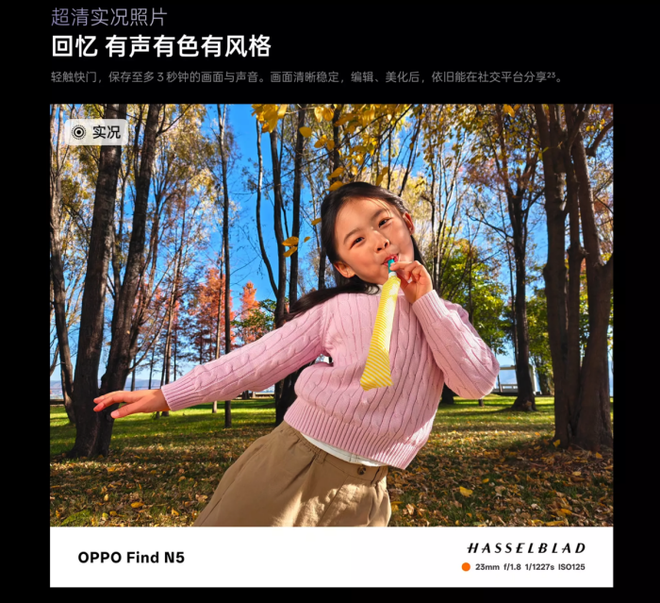 此外,Find N5引入了无影抓拍功能,能够捕捉最自然的画面,确保每一个精彩瞬间都被清晰记录。同时,长焦微距功能利用长焦镜头的微距拍摄能力,捕捉微小细节,适合拍摄花卉、饰品等精致物品。 与哈苏的合作也为Find N5带来了专业人像模式和哈苏风格化色彩,使照片色彩更为鲜艳、真实,提升整体影像质感。
