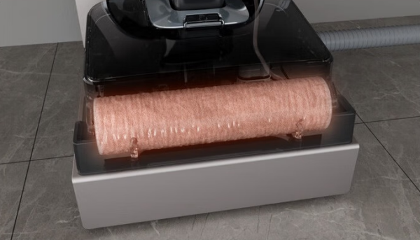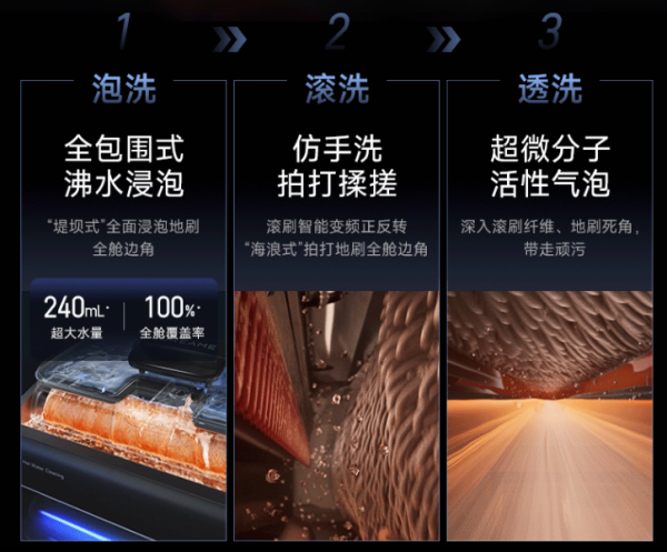 以追觅最新推出的T50 Ultra洗地机为例,搭载的100℃火山湖浸泡洗技术是由泡洗、滚洗、透洗这三个环节组成。其底座采用堤坝式储水结构,水量可达到240ml高水位,泡洗时,底座PTC将清水加热至100℃,可深度浸泡地刷、挂条、吸污口、内壁等部件。在浸泡过程中,滚刷变频正反转模拟人手揉搓的动作,同时沸水翻滚形成“海浪式”拍打,进一步清除地刷内腔的深层顽固污渍。在滚刷搅动时,利用生成的超微分子活性气泡,持续深入滚刷纤维、地刷死角带走顽固污渍。