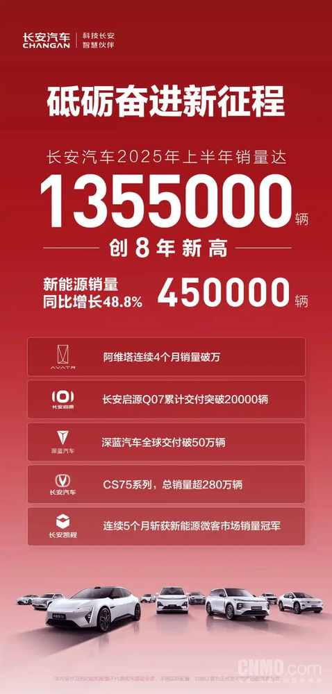 CNMO回顾上半年,长安汽车销量达135.5万辆。其中,新能源汽车销量为45万辆,同比增长48.8%。从长安汽车官方公布的数据来看,阿维塔连续4个月销量破万;长安启源Q07累计交付突破2万辆;深蓝汽车全球交付破50万辆;长安引力CS75系列,总销量超280万辆;长安凯程连续5个月斩获新能源微客市场销量冠军。