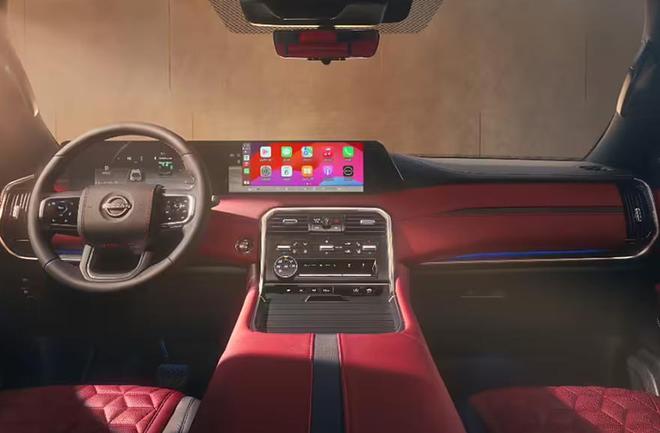 配置上,新车标配双12.3英寸联屏,内置NissanConnect 2.0智能座舱系统。此外,中高配车型还会升级为双14.3英寸联屏以及HUD抬头显示的组合。不得不说,双联屏的使用让途乐的车内也终于是和科技感沾边儿了。
