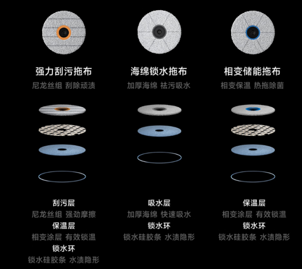 咱们先来看看追觅配备的"拖布全家福"都能干啥,首先是强力刮污拖布,表面带有尼龙丝,轻松刮除厨房餐厅那些黏腻、顽固污渍;针对卫生间和宠物区域,采用了加厚海绵的锁水拖布,吸水能力超强,地面速干不留水痕;最后一个是相变储能拖布,可以恒温热水拖地,适合客厅卧室区域。