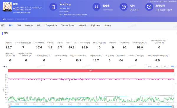 《原神》这游戏有多吃性能不用多说,开启1.5K超分后,护盾纹路、草地光影层次,甚至水面的波纹反射都非常清晰,帧率稳定在59.7帧左右。