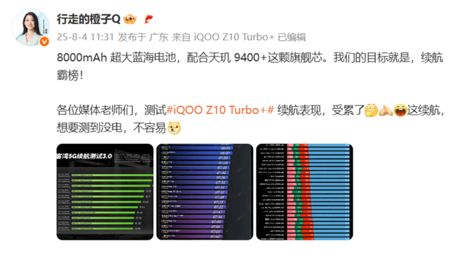 8000mAh 超薄蓝海电池更是直接杀疯,@行走的橙子Q 晒出极客湾、WHYLAB 和 DTCHAT 的续航榜单,iQOO Z10 Turbo+ 以较大优势领先榜单第二名,轻松问鼎续航冠军宝座,夯实“行业唯一的长续航旗舰性能机”之名。