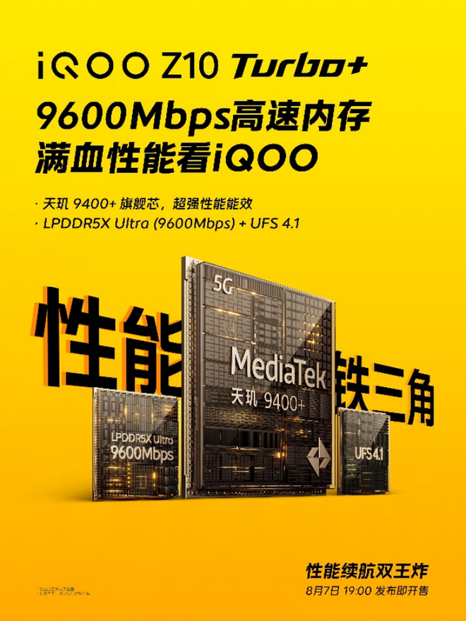 一个好汉三个帮,不止搭载旗舰平台,iQOO Z10 Turbo+ 还拥有多项旗舰同款硬核配置,共铸至强性能 — 速度更快、功耗更低的 LPDDR5X Ultra(9600Mbps)和读写速度更快的 UFS 4.1,助天玑 9400+ 实力尽兴发挥;采用一体化压铸工艺的 iQOO 最大 7K 冰穹 VC,精准覆盖核心热源,让 iQOO Z10 Turbo+ 在“激战”时刻依然可以高能持久输出,轻松冷静制胜。