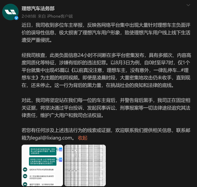 经公司内部核查,相关内容的发布时间、传播路径、语言模版等高度相似,明显带有“规模化”“流水线式”的痕迹,背后极可能存在有组织的操作。理想法务部对此正式发声,称此类行为涉嫌违法,并正在对相关内容进行证据留存与溯源。