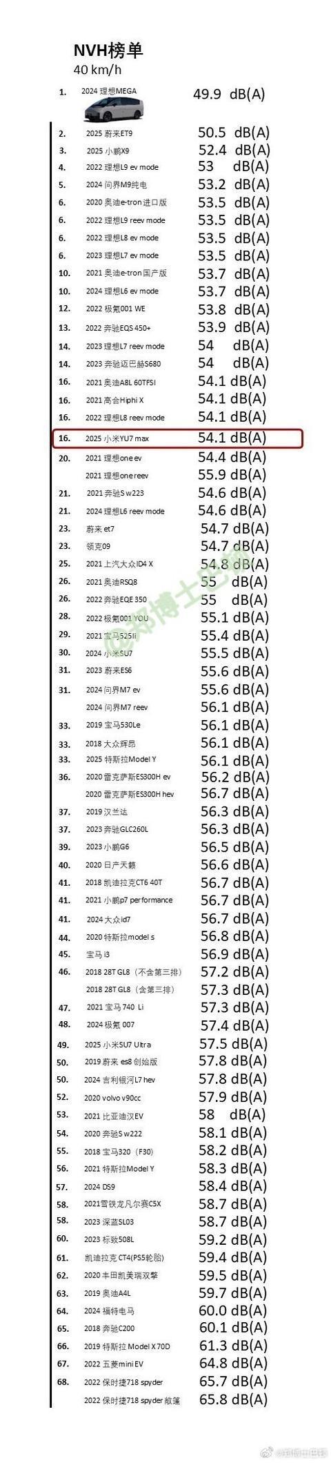 小米YU7 Max登顶静态隔音榜超越蔚来ET9奔驰S级