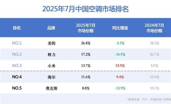 8月16日消息,近日,7月份的空调市场数据陆续出炉,根据权威机构调研显示,25年7月中国空调市场销量TOP5品牌依次为美的、格力、小米、海尔、奥克斯。