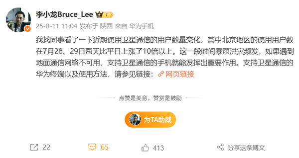 2025年7月,北京遭遇极端暴雨灾害,地面网络一度中断,无数群众陷入与外界失联的困境。而华为手机的卫星通信功能,在此刻成为了灾区群众的 “救命稻草”。7 月 28 日,灾区居民 “驴子” 在微博分享自救经历:无地面网络时,通过华为手机卫星通信功能成功发送求救信号与定位信息,为救援争取关键时间。7月31日,“驴子” 再次发文点赞华为 Pura 70 系列卫星通信功能,透露其在灾害中多次助力与外界联系,华为终端 BG CTO 李小龙也在评论区互动致谢。