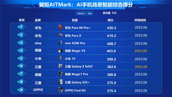 在本次论坛发布的核心榜单中,华为Pura 80 Pro+斩获多项第一。在翼矩AITMark - AI助手智能体评测中,小艺智能体以354.8分的成绩排名第一;翼矩AITMark - AI手机场景智能综合得分评比里,华为Pura 80 Pro +强势登顶,且在AI影像、AI 社交、AI 学习、AI 办公四大核心场景中均位列第一,AI生活场景排名第二。