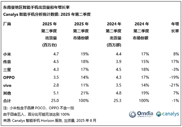 据CNMO了解,小米不止于俄罗斯单一海外市场取得好成绩。Canalys最新数据显示,2025年第二季度,小米以470万台的出货量和19%的市场份额位居东南亚手机市场首位,实现同比增长8%;小米在中东地区(不含土耳其)手机出货量为230万台,市场份额小幅提升至20%,位居第二。