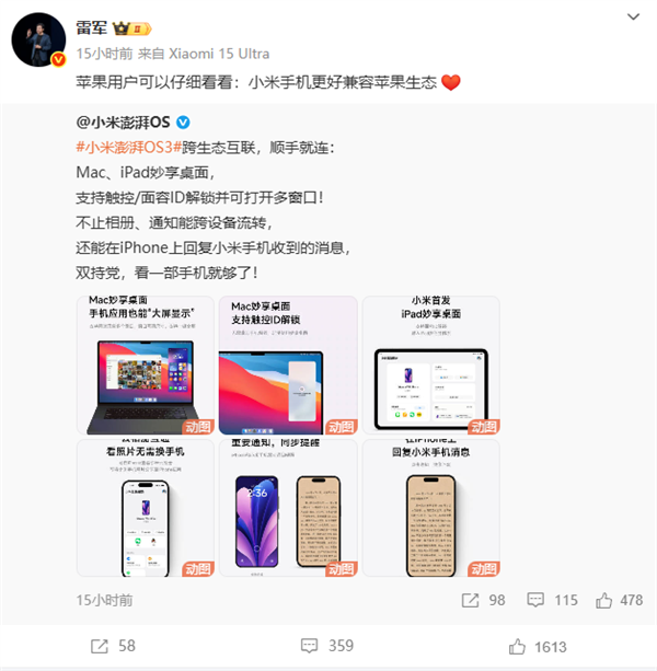 澎湃OS 3发布后,小米CEO雷军发文称:"苹果用户可以仔细看看:小米手机更好兼容苹果生态。"