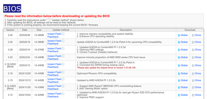 华擎AMD AM5平台部分X870E/X870/B850主板最新的3.40版本的BIOS更新带来了内存兼容性和系统稳定性提升,增强CPU运行稳定性,以及将AGESA升级到ComboAM5 1.2.0.3f版本。