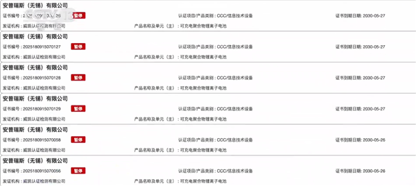值得注意的是,此前罗马仕的自燃充电宝电芯也是来自安普瑞斯,该公司拥有的74张3C证书,均被认证机构暂停或撤销,无锡市市场监管局此前已依规对该企业生产的锂电池产品全部封存。