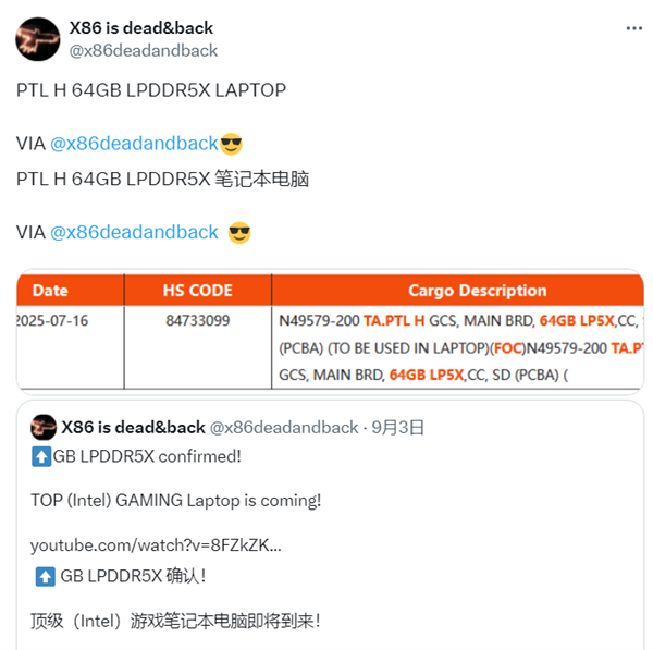 9月5日消息,近日X86 Dead & Back发现的运输清单显示,Intel下一代笔记本电脑平台Panther Lake将配备64GB的LPDDR5X内存。