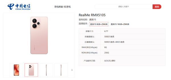 据了解,真我15系列此前已在中国电信终端产品库亮相,提供8GB+256GB、16GB+256GB两种存储规格,拥有钛灰 (灰)、樱粉两种配色。