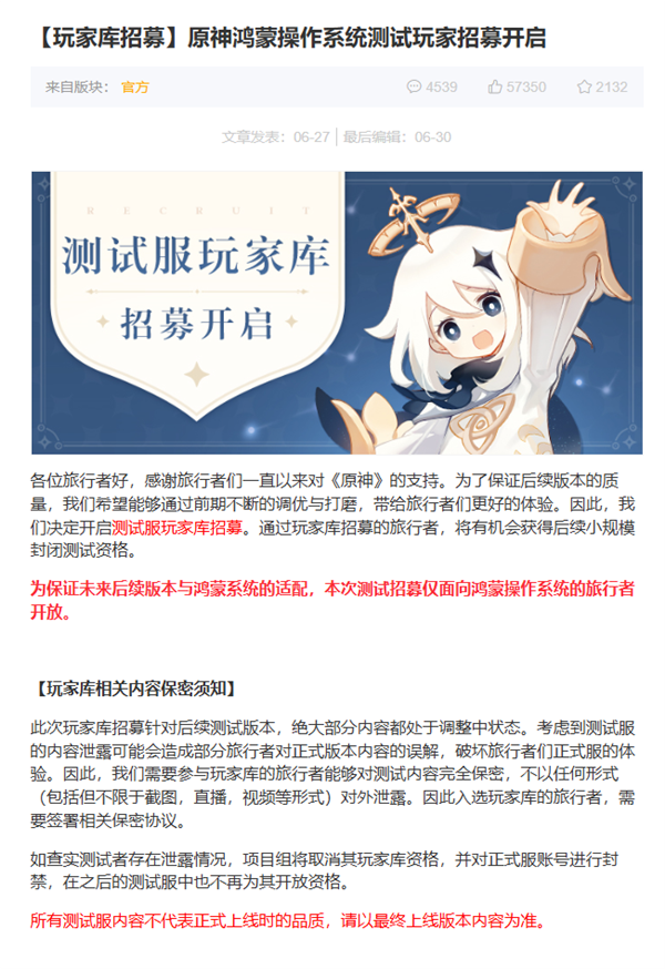 据了解,今年6月,米哈游宣布开启《原神》鸿蒙操作系统测试玩家招募。