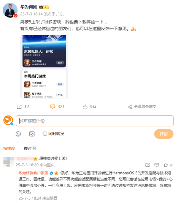 7月4日消息,日前,华为终端BGCEO何刚微博发文,称鸿蒙5上架了很多游戏,我也要下载体验一下。